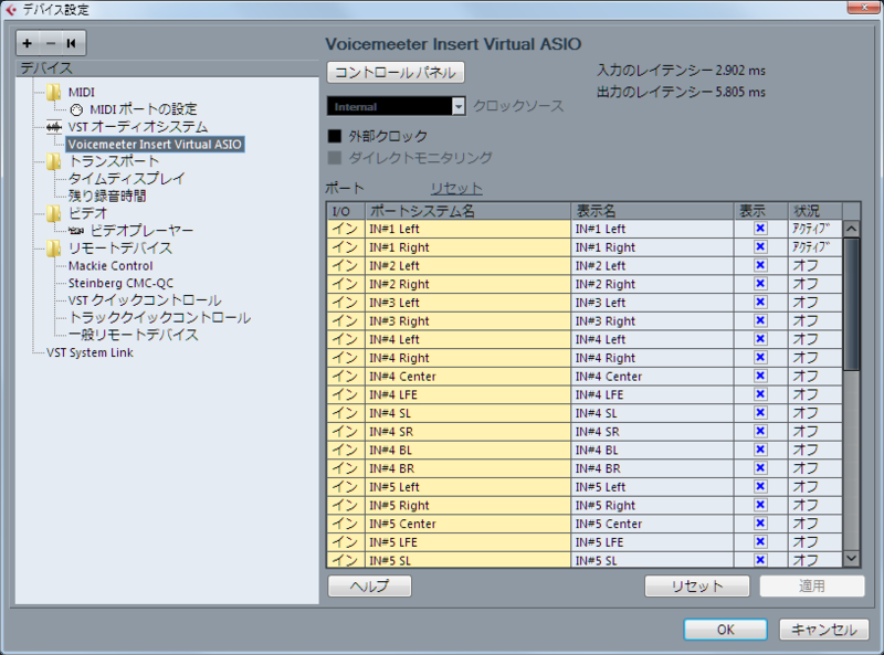 Cubaseで「Voicemeeter Insert Virtual ASIO」を選択すると22入出力が扱える。