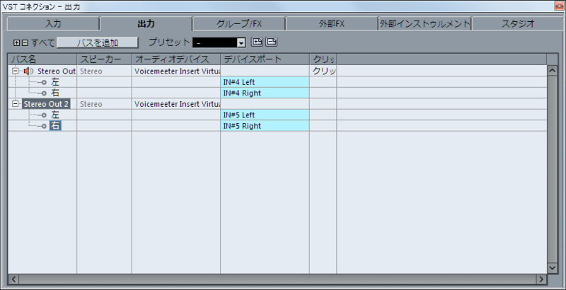 VSTコネクションで2系統の仮想ASIOのLRでバスを作成。