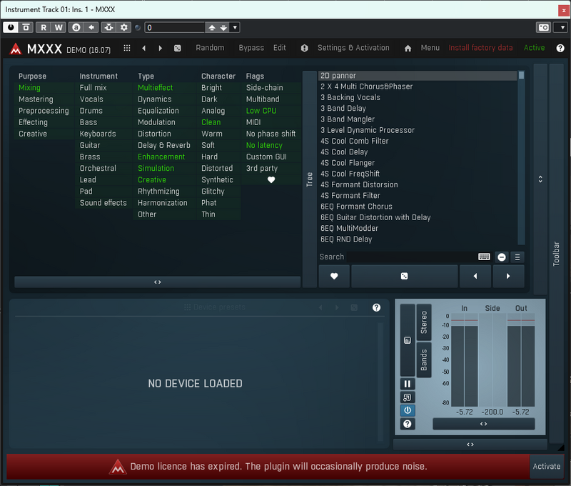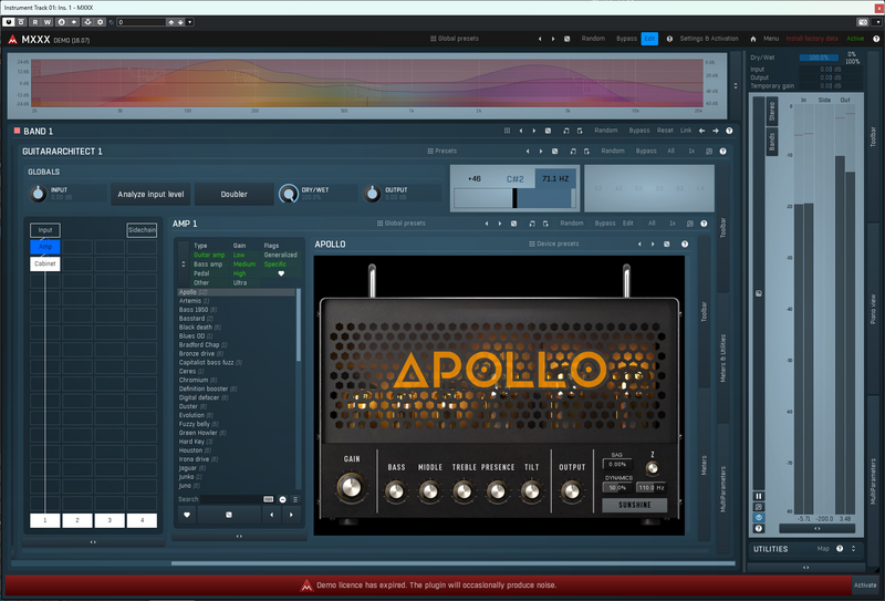 デモ版で軽くMGuitarArchitectのプリセットをお試ししつついぢってみると、イマイチ物足りない印象。IK Multimedia AmpliTube 5と比べるとラインっぽいとゆーか、艶っぽくないとゆーか、なんとなく盛り上がらず。MXXXにはGuitarArchitectも入ってるので、MXXXが手に入るなら個別に入手しなくても良いかも。