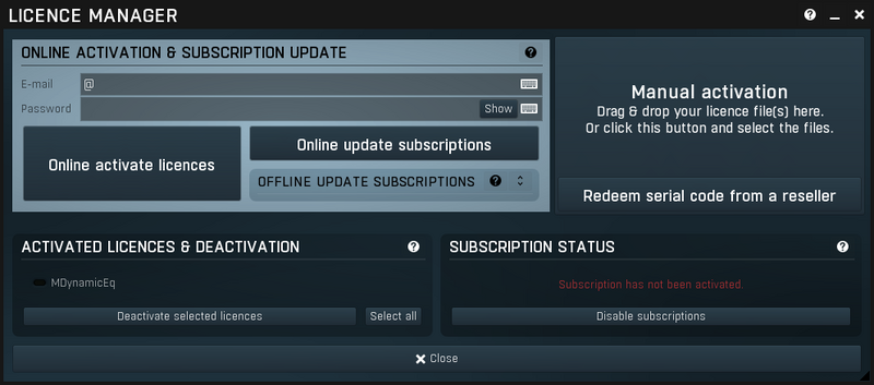 「LICENCE MANAGER」で「Manual activation。アカウントからダウンロードした「MCompleteBundle.mlf」をドロップするだけ。