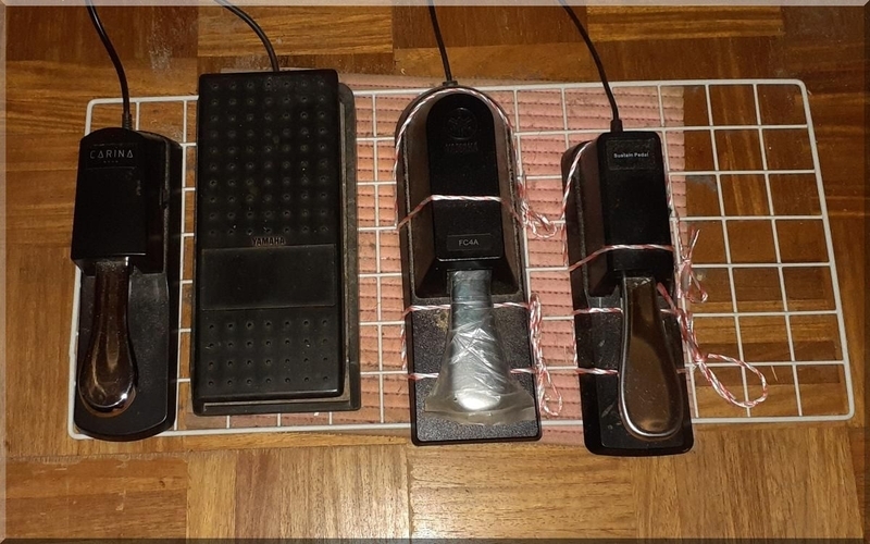 現在足元は左からKROSS 2用フットスイッチ(こちらで入手した「CARINA」)、ペダル(YAMAHA FC7)、ダンパー(FC4)、Graphite 49用ダンパー(こちらで入手した「Aliペダル」)となっているが、両ダンパーの扱いが少々面倒(^_^;Graphite 49のダンパーを左端に移動すると良さそな気もするが、以前は上下用のダンパーを並べていたので全体的に左に移動するだけで良いのかも。当時下段とゆーかHP-800用のダンパーは右端だったかもだが、覚えてない(笑)